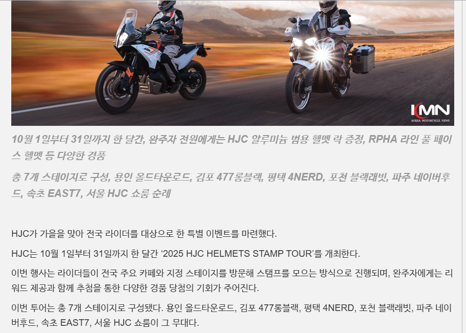 기사 전문 보기 : [한국이륜차신문] HJC 헬멧, 전국 라이더와 함께하는 '2025 스탬프 투어' 개최 |