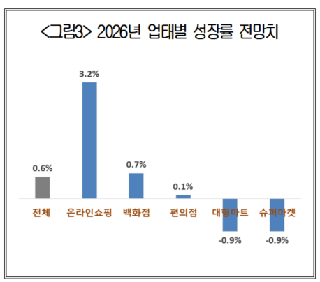 高물가, 소비심리 위축 등으로... 내년 소매유통 성장률, 5년 내 최저 전망 - 대한상의 조사, ‘2026년 유통산업 전망 조사’... 2026년 소매유통시장 ‘0.6%’ 성장 전망 - 업태별 희비 엇갈려... 온라인 3.2% 성장, 대형마트․슈퍼마켓 등 오프라인은 ‘위축’ - 상의 “소비 진작책, 글로벌 스탠더드에 맞는 규제개선, 성장잠재력 확충 등 대책 필요” - 2025년 유통업계 7대 뉴스 : ‘민생회복 소비쿠폰’, ‘내수부진 지속’, ‘온라인 성장세 둔화’ 등 꼽아