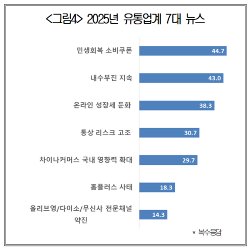 유통업계의 관계자들은 2025년 유통업계 7대 뉴스 중에서‘민생회복 소비쿠폰(44.7%) 지급’을 1위로 꼽았다. 경기 침체 속에서 내수 진작을 위해 추진된 민생회복 소비쿠폰은 전통시장, 중소형 슈퍼 등 근린형 채널을 중심으로 매출 증대 효과가 나타났다.