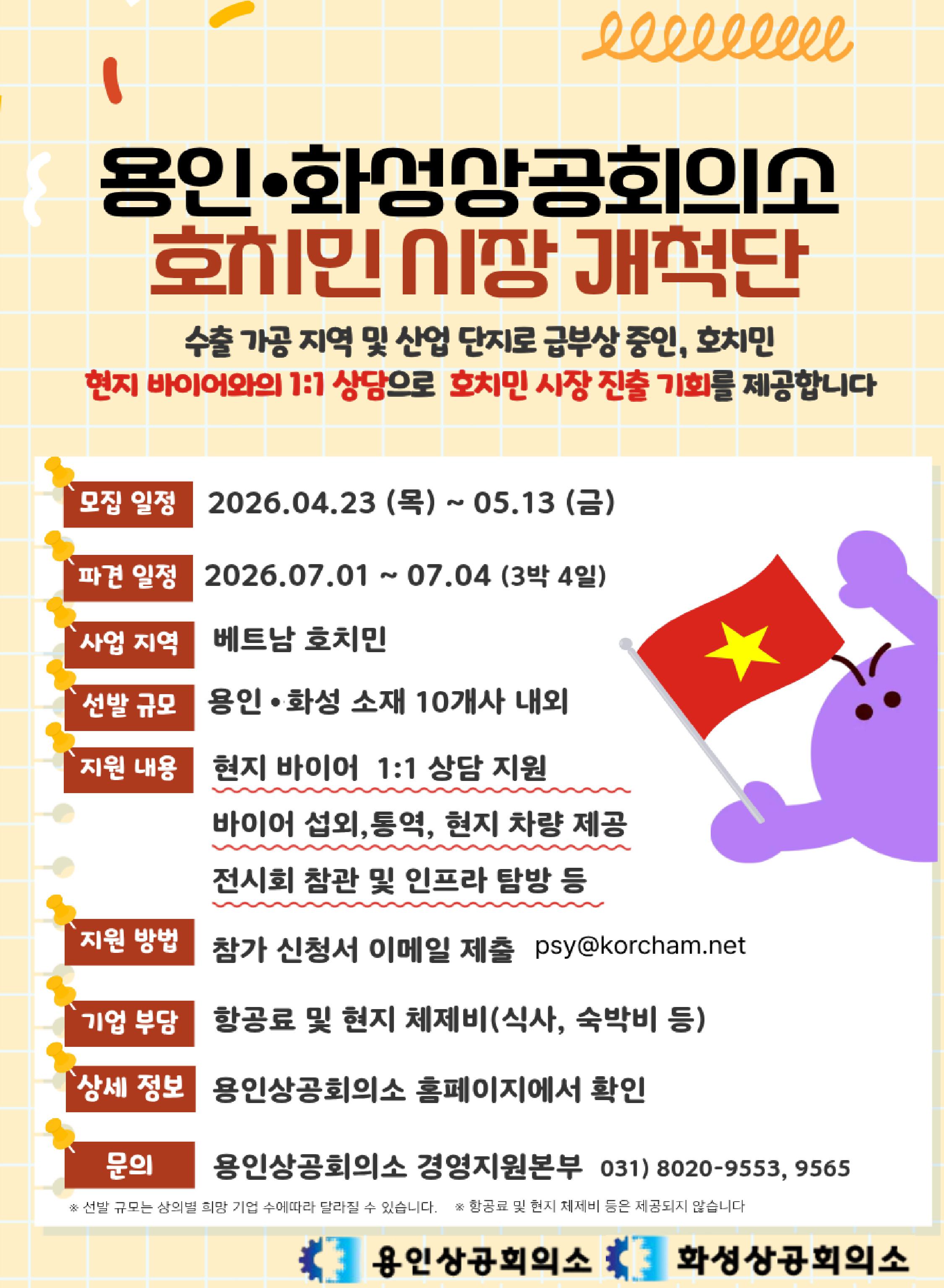 | ‒ | 2026 용인·화성상공회의소 호치민 시장개척단 모집공고 |
