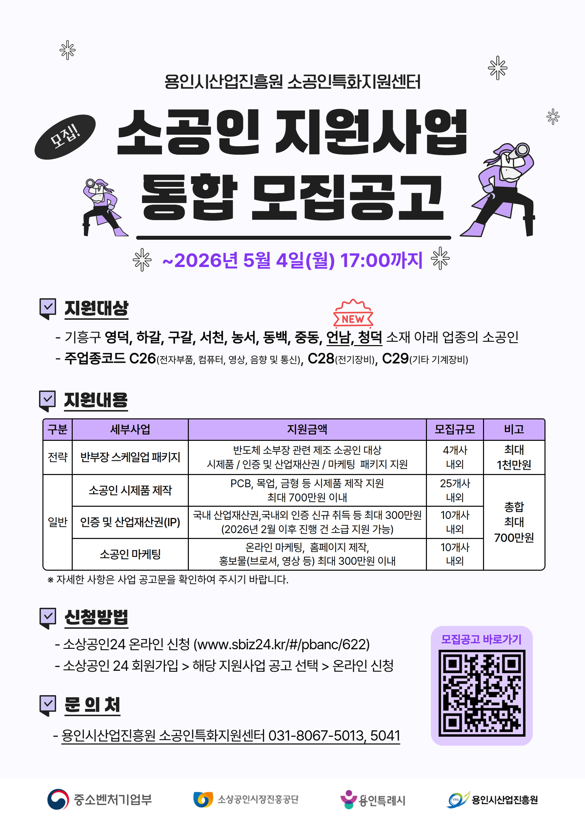 가. 사 업 명: 2026년 소공인특화지원센터 지원사업 통합 모집 나. 지원규모: 총 4개 지원사업, 49개사 내외 다. 지원자격: 기흥구 영덕, 하갈, 구갈, 서천, 농서, 동백, 중동, 언남, 청덕 소재 주업종 C26, C28, C29 해당 소공인 라. 지원내용: (전략) 반부장 스케일업 패키지 → 기업당 최대 1,000만원 지원 (일반) 소공인 시제품 제작, 인증 및 산업재산권, 마케팅 지원 → 기업당 총합 최대 700만원 지원 마. 신청기간: ~ 2026. 5. 4.(월) 17시까지 바. 공고링크: https://ybs.ypa.or.kr/poratlAppFormDtl.do?regNo=RGS_0000000000000578 사. 문의사항: 용인시산업진흥원 소공인특화지원센터(031-8067-5013)