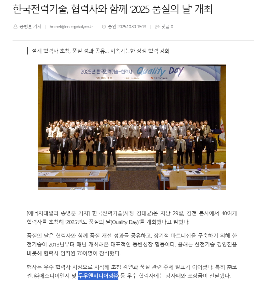기사 전문 보기 : [에너지데일리] 한국전력기술, 협력사와 함께 ‘2025 품질의 날’ 개최  |