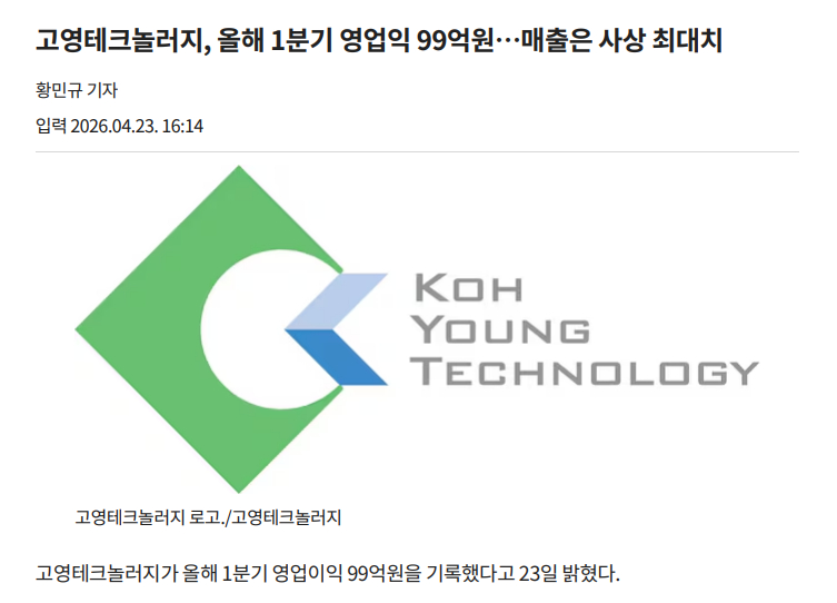 기사 전문 보기 : [조선비즈] 고영테크놀러지, 올해 1분기 영업익 99억원…매출은 사상 최대치 |